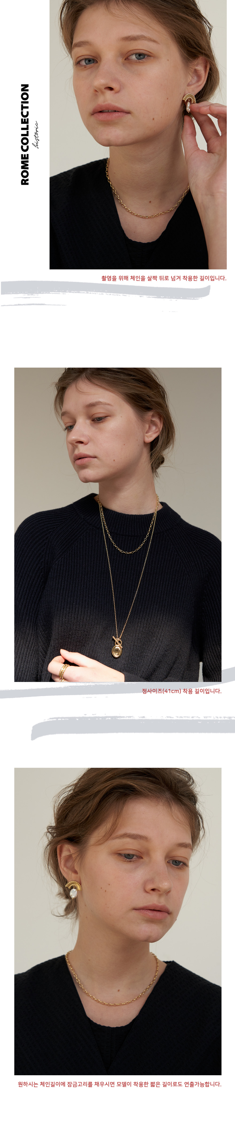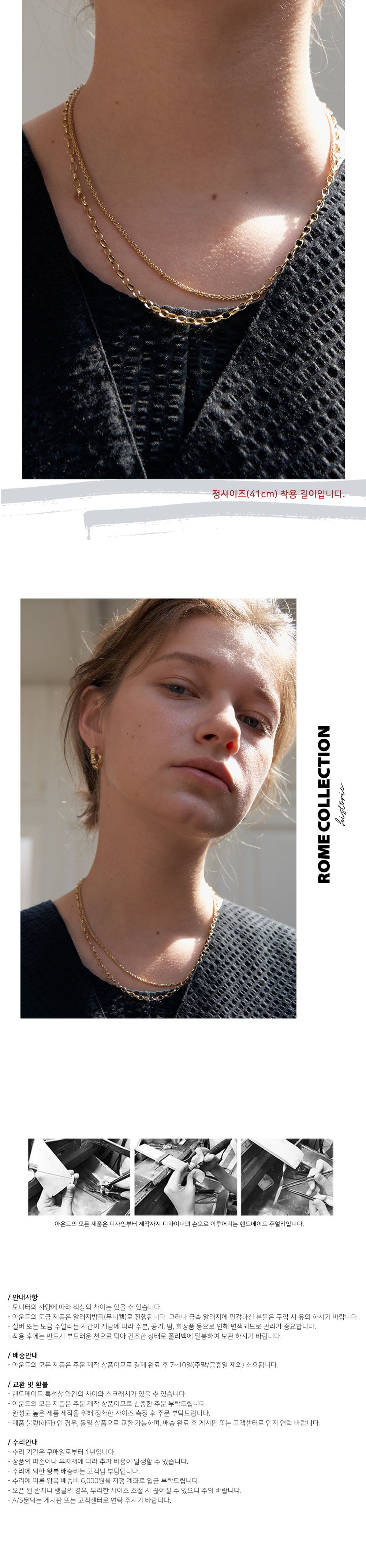 부드러운 둥근 타원 형태의 체인 목걸이입니다. 도톰한 사이즈로 단독으로 착용하시기에 좋으며 어떠한 룩에도 매치가 쉽고 데일리로 활용도가 높습니다. 다른 목걸이들과 레이어드하여 스타일링 시 기본이 되는 아이템입니다. 기본 41cm로 제작되지만 체인 자체에도 잠금 고리를 채우실 수 있어 초커타입으로 길이를 ,줄여서 착용 가능한 제품입니다.
